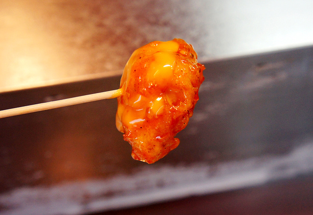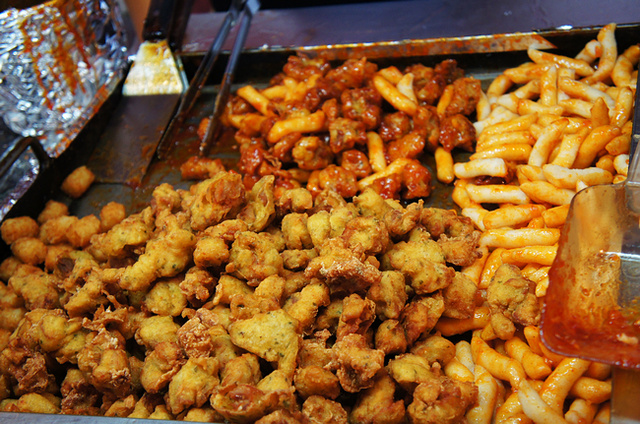 有薯球、雞塊、年糕,然後再裹上一層辣辣甜甜的醬料,在台灣還真的沒有吃過耶!