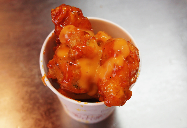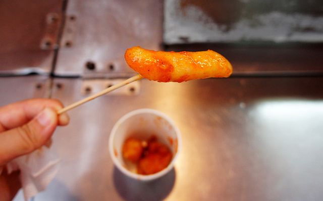 老闆會將炸好的雞塊、薯球及年糕給它裹上一層韓式的甜辣醬再放到杯子上
