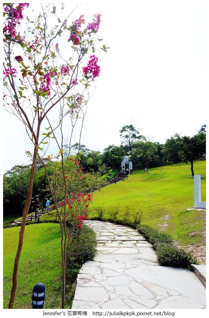 我們沿著兩排種植小花的階梯往回走,因為出口和入口是同一個喔!