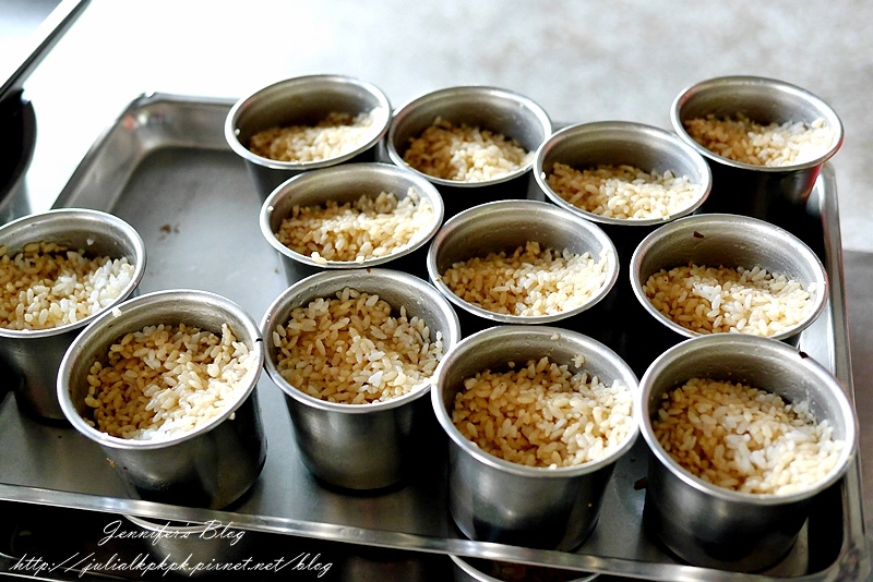 先將白米煮熟後淋上肉燥的滷汁,拌一拌後放入下圖的鐵杯裡,然後再放入蒸籠