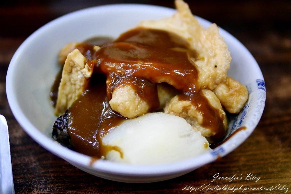 甜不辣 45元,光是這碗就可以讓我吃的很飽了,料滿多的! 而且他們的醬還不錯吃,有點甜甜鹹鹹的,和甜不辣味道滿搭的喔!