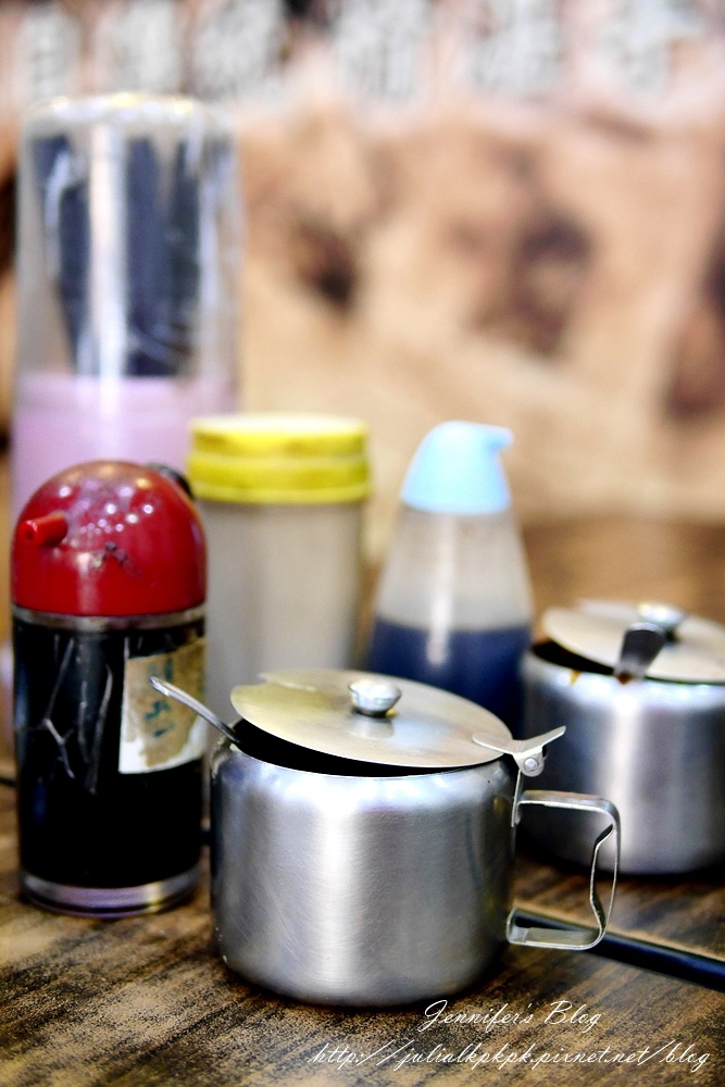 桌上的醬料,像鋼杯一樣有加蓋的裡面裝的是蒜泥和辣豆瓣醬