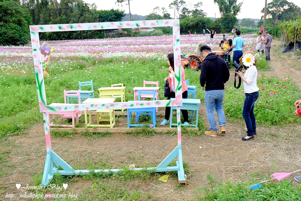 在花田裡擺放了一些彩色的課桌椅,超繽紛。