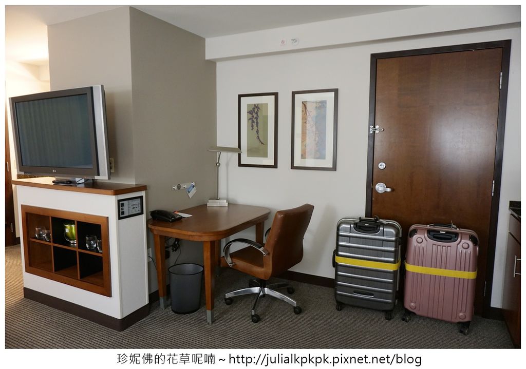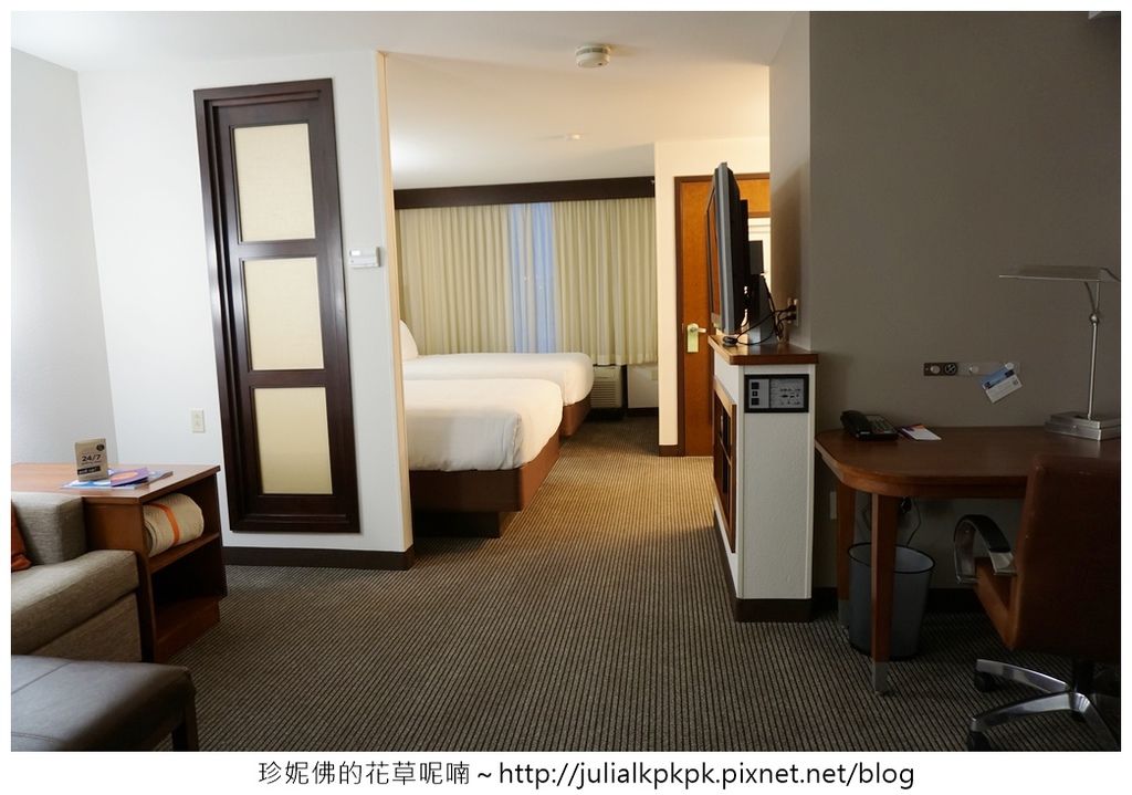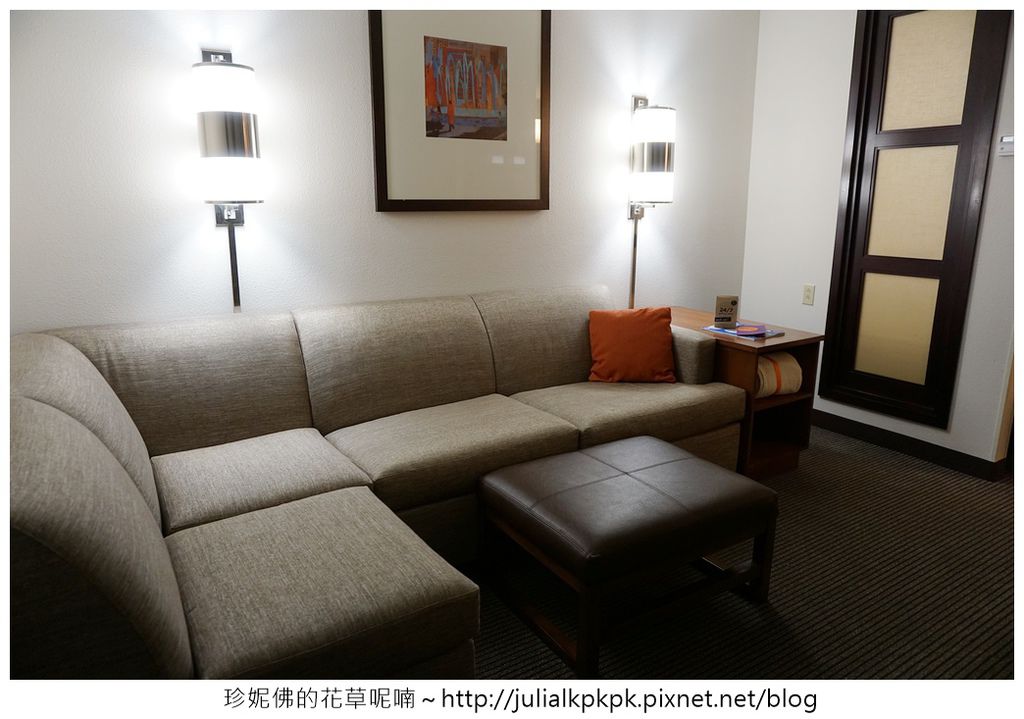 雖然說Hyatt Place雖然規模不大,但是房間的空間還算寬敞,而且設備齊全,房門一打開就有個L型沙發