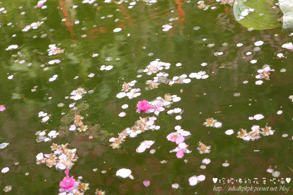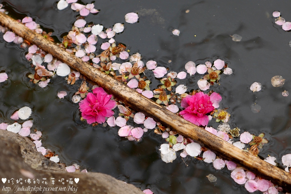 小屋旁邊的水池,上面落滿了花瓣