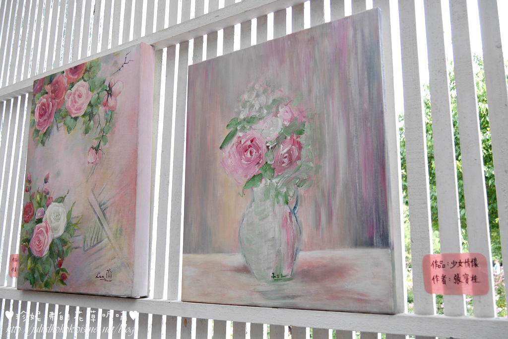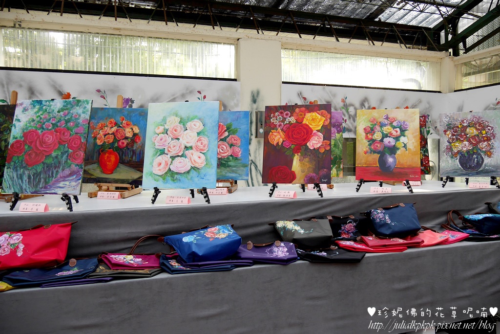 除了展示的畫作之外,下方還有玫瑰彩繪的提袋