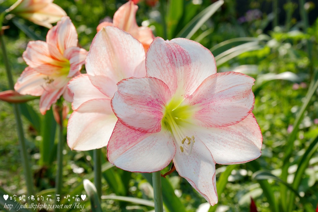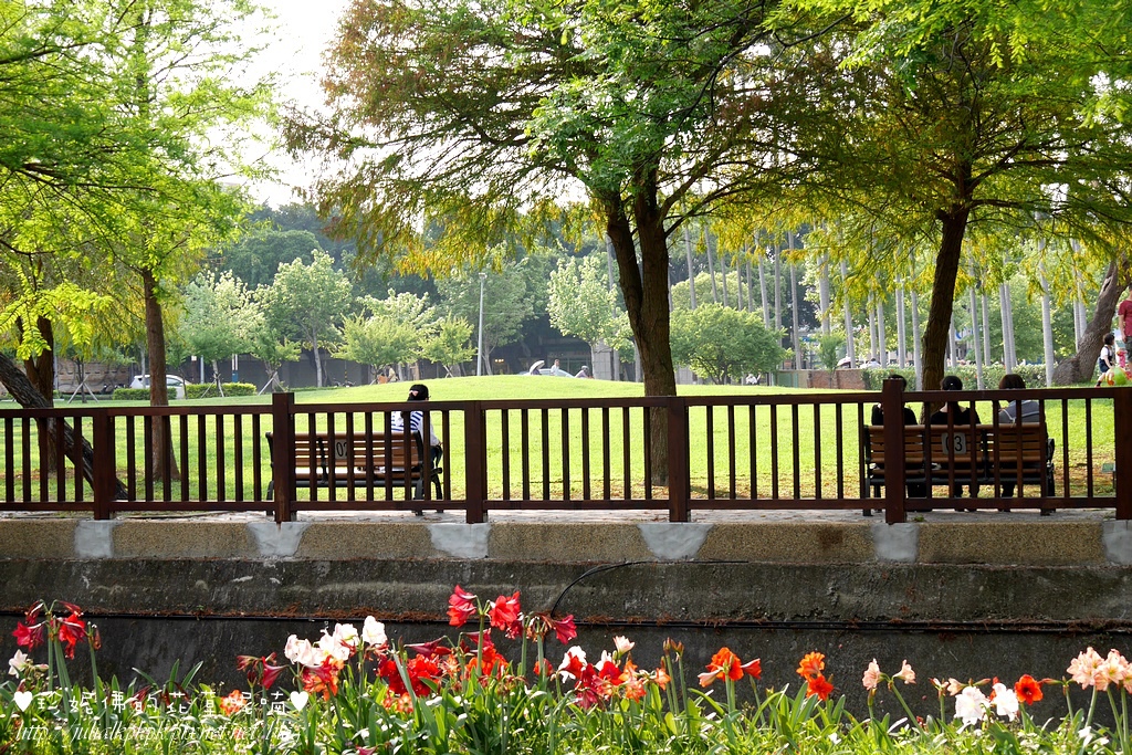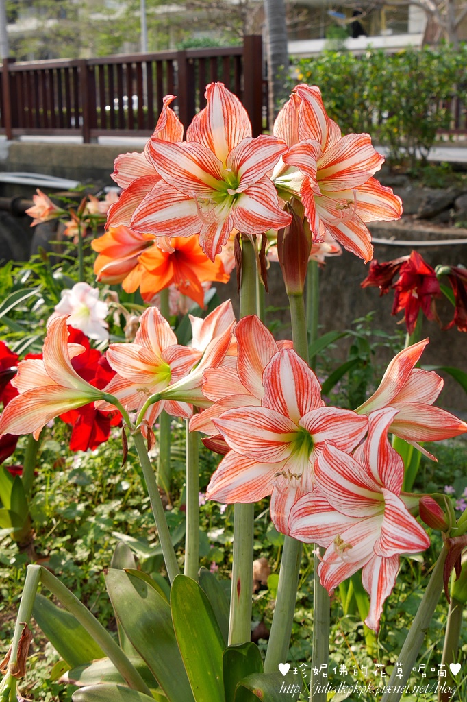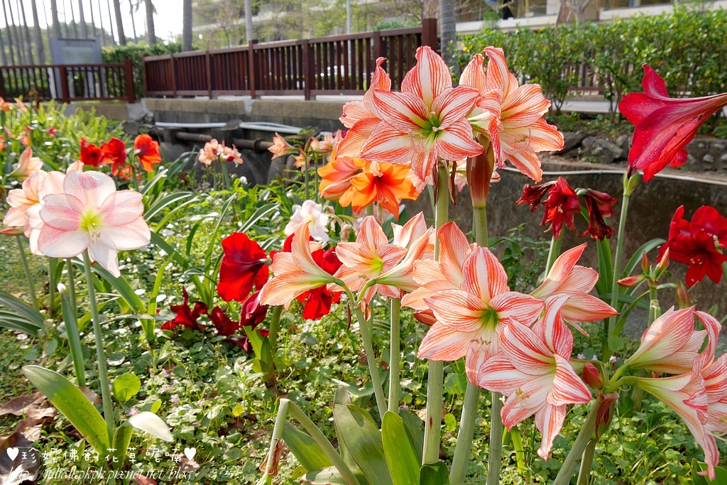 公園的樹下種植了一整排顏色繽紛鮮豔的孤挺花,也是相當的吸睛。