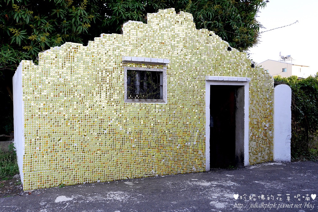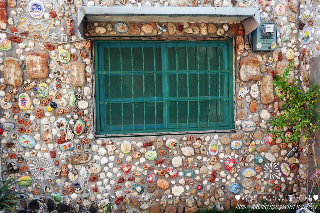 廟旁邊有戶人家的牆壁是用類似貝殼妝點,看起來好特別