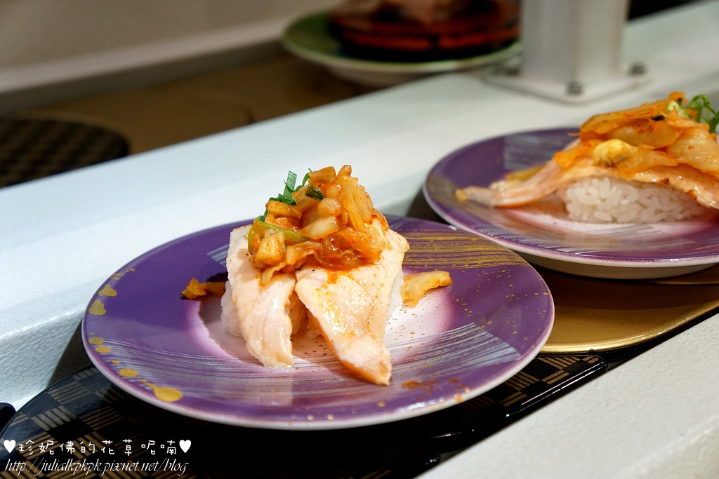 這是我們從迴轉盤上拿來的,很可惜的是這種熟食已經轉到整個涼掉了,風味大減!