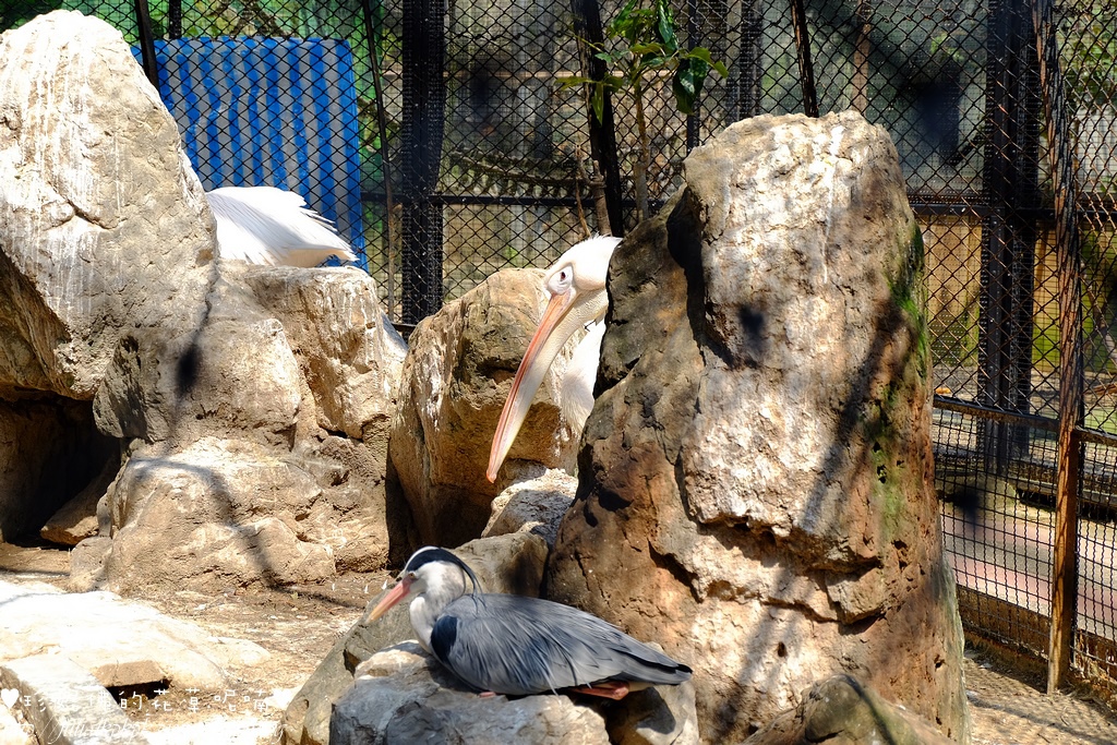 半圓形的大鳥籠中有著蒼鷺、白鵜鶘和埃及聖朱鷺