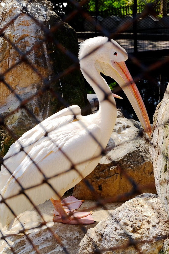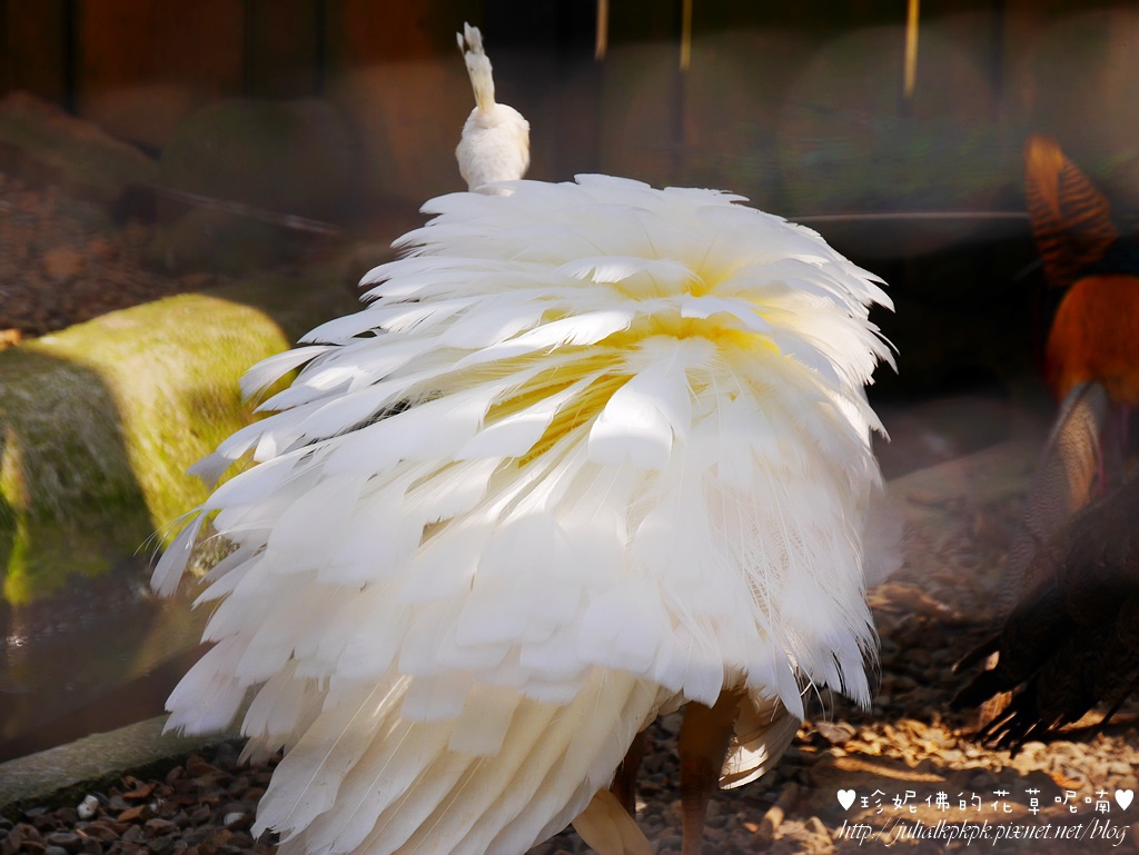在白鵜鶘旁邊有養了幾隻白孔雀與藍孔雀,羽毛很漂亮,可惜沒有看到孔雀開屏!