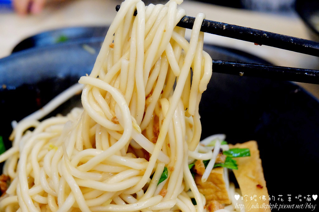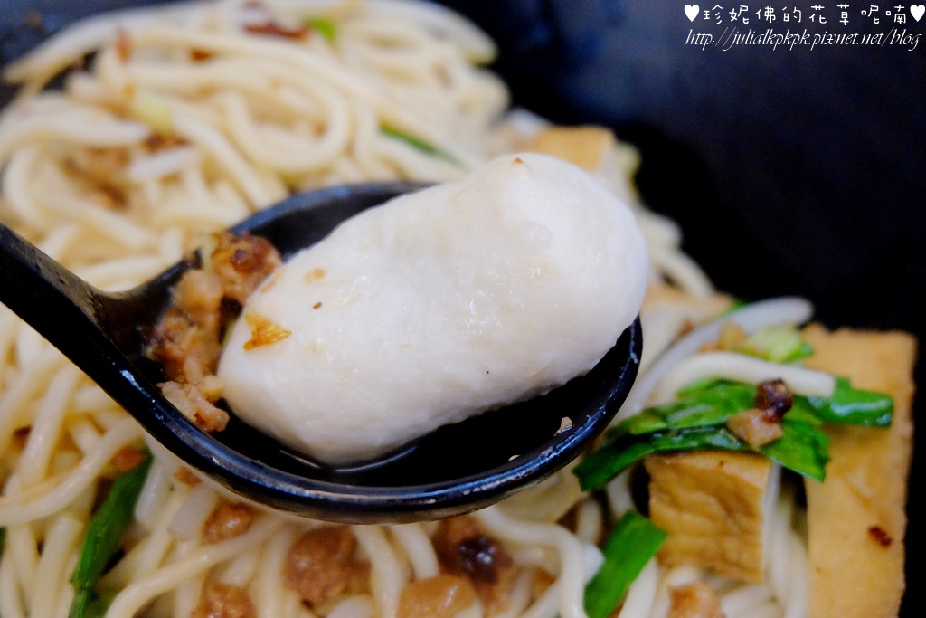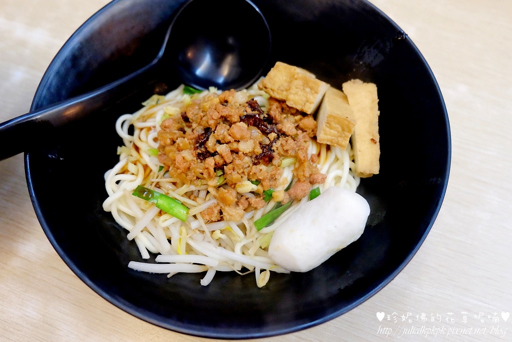 古早味蔥香乾麵,除了一般的豆芽菜及韭菜之外就是豆腐和淡水魚丸囉!