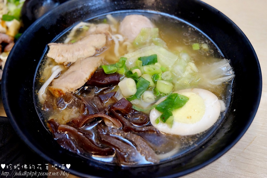 招牌蔥香拉麵,配料有一顆貢丸、半顆滷蛋、木耳及肉片