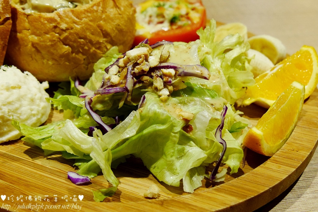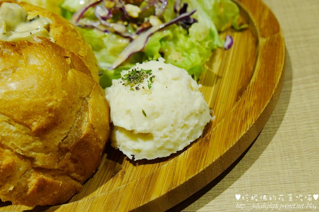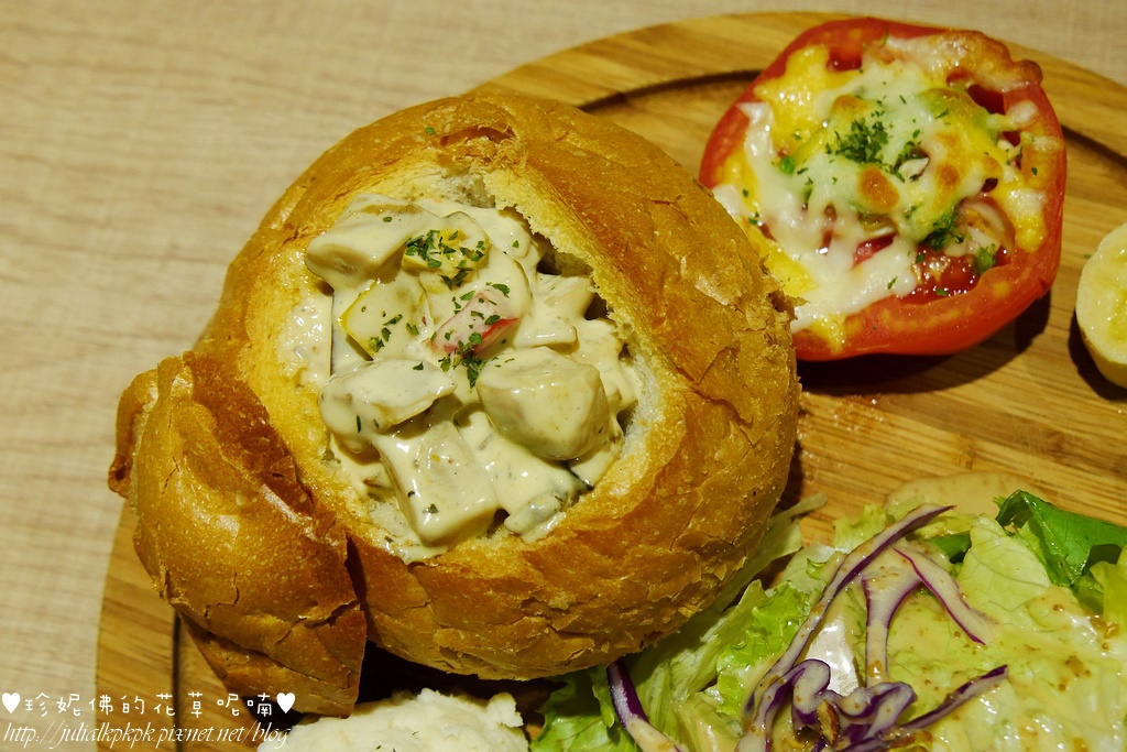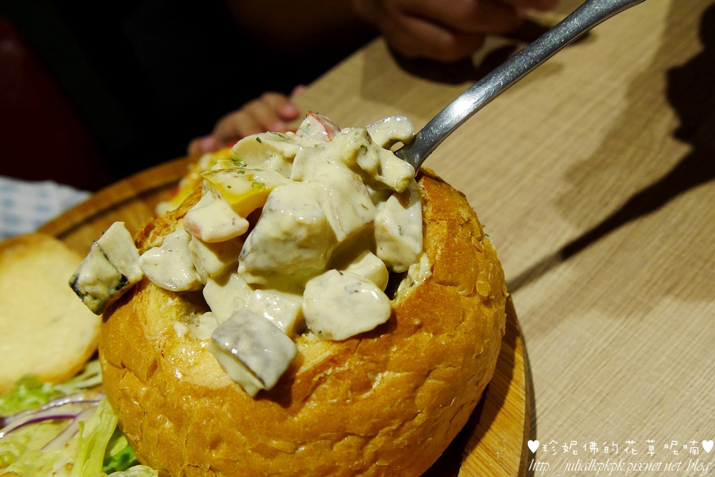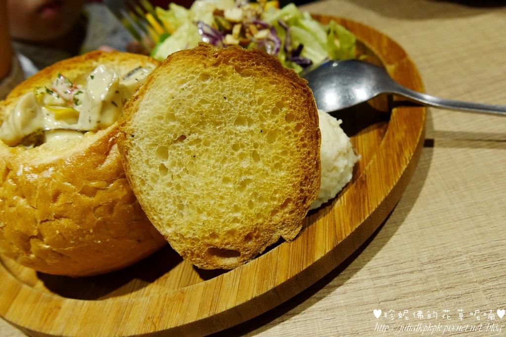 麵包盅還蠻特別的說,在早午餐中似乎比較少見,挖空的麵包裡頭裝的是炒野菇