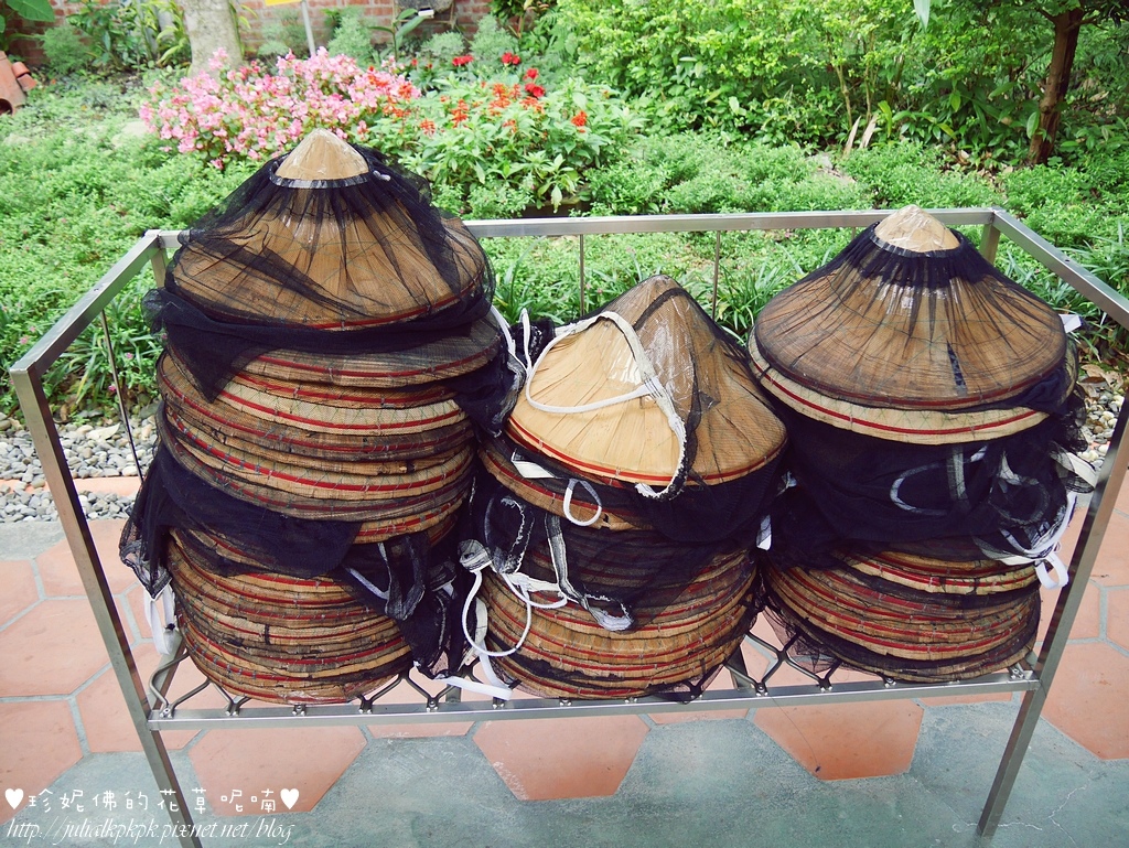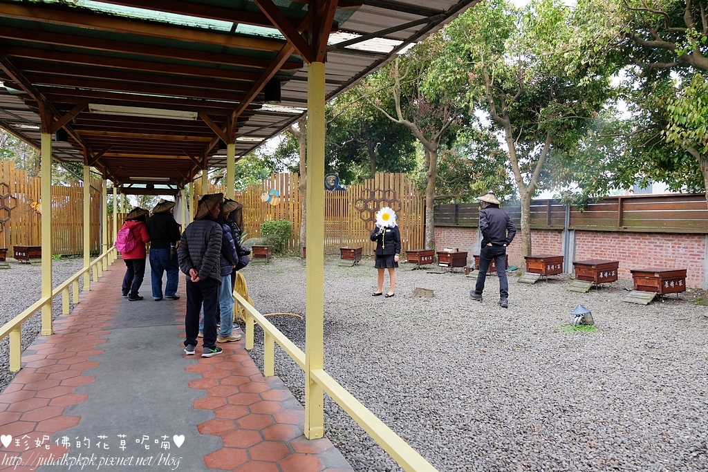 來到蜜蜂生態園區大家會先戴上有防護網的斗笠,包含導覽人員也是喔,不過也是有人選擇不戴