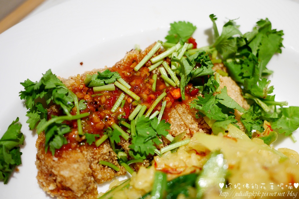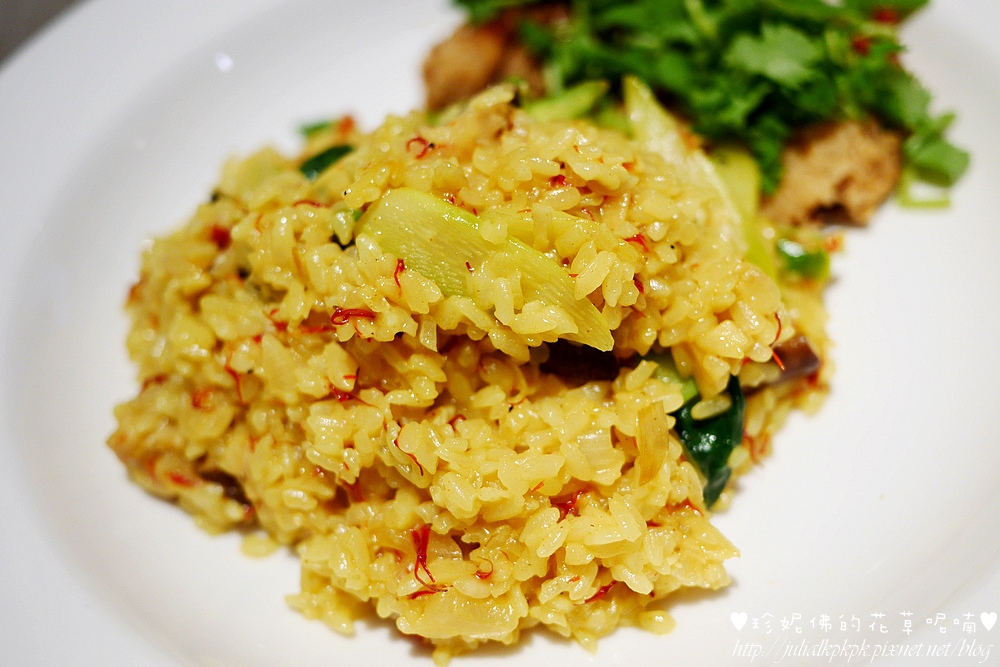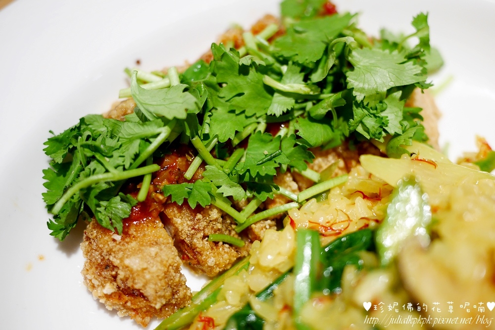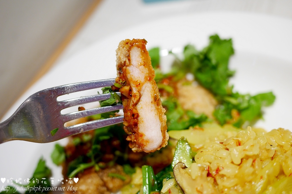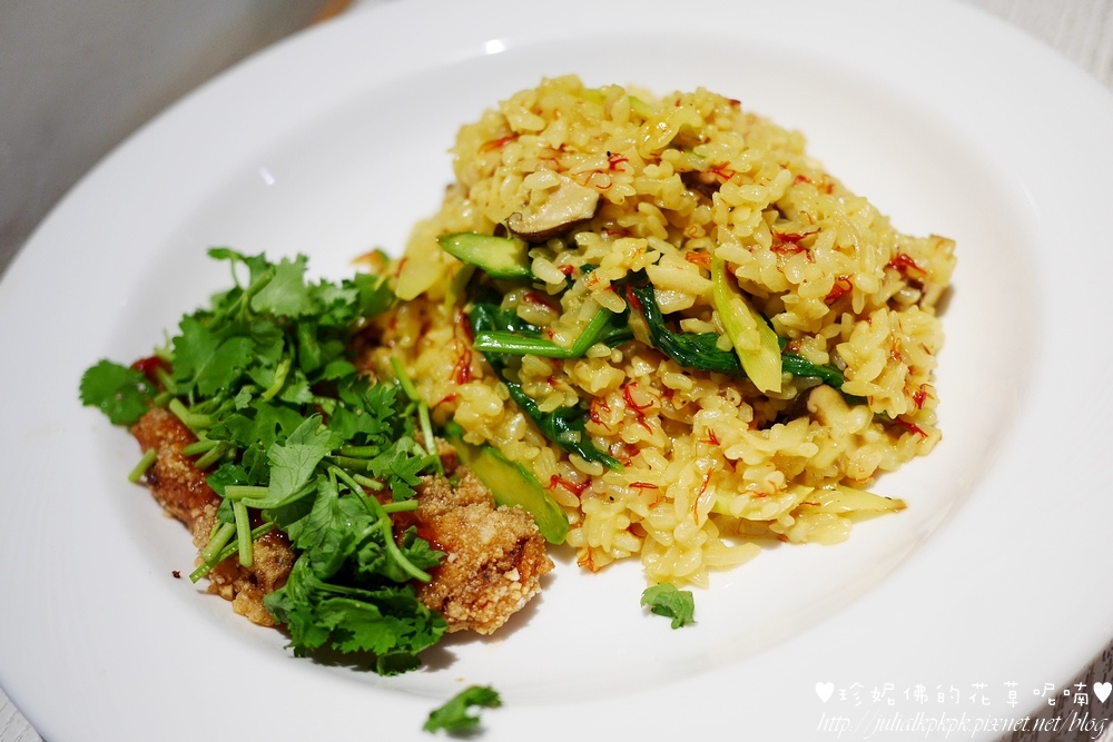 主廚泰式雞排番紅花黃燉飯,看到雞排上的香菜真令人開心