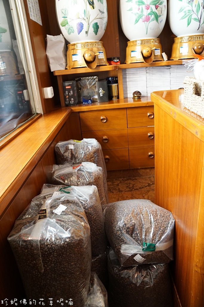 後面大陶瓷罐裝的都是不同風味的咖啡豆,看需要多少的量店員會幫忙秤好