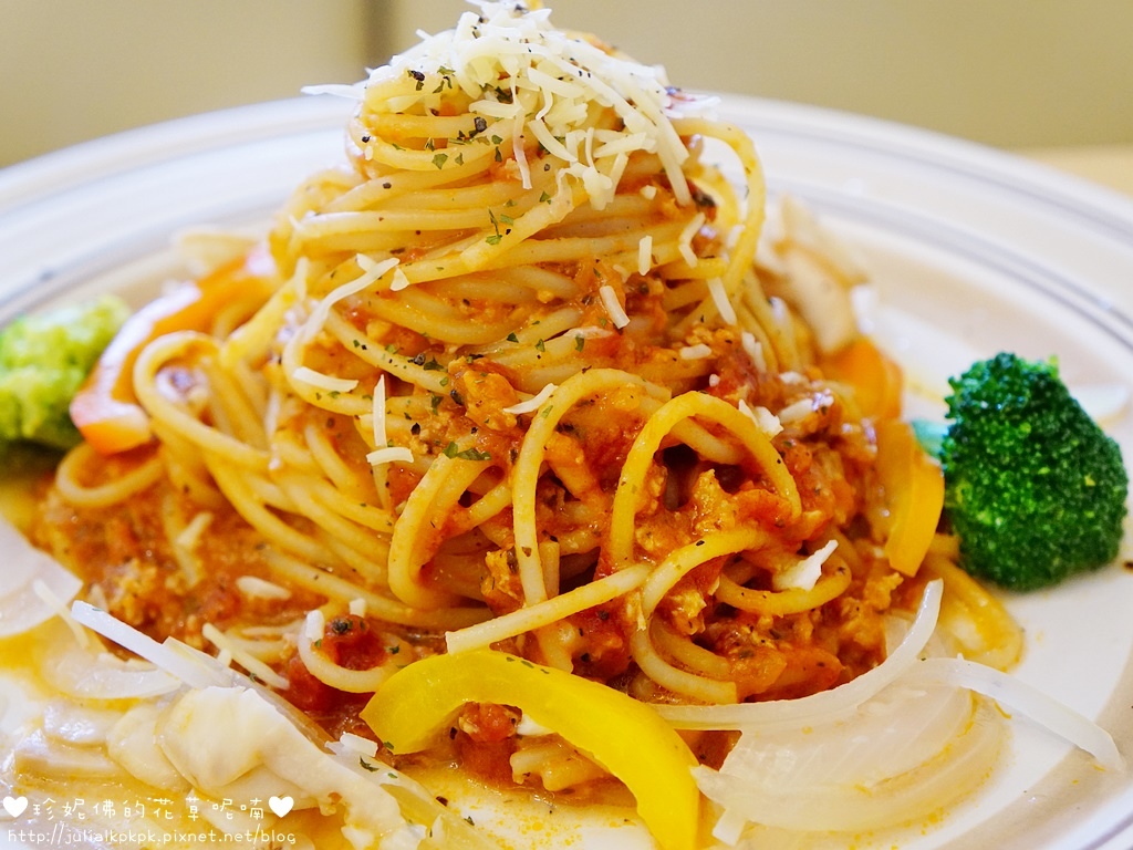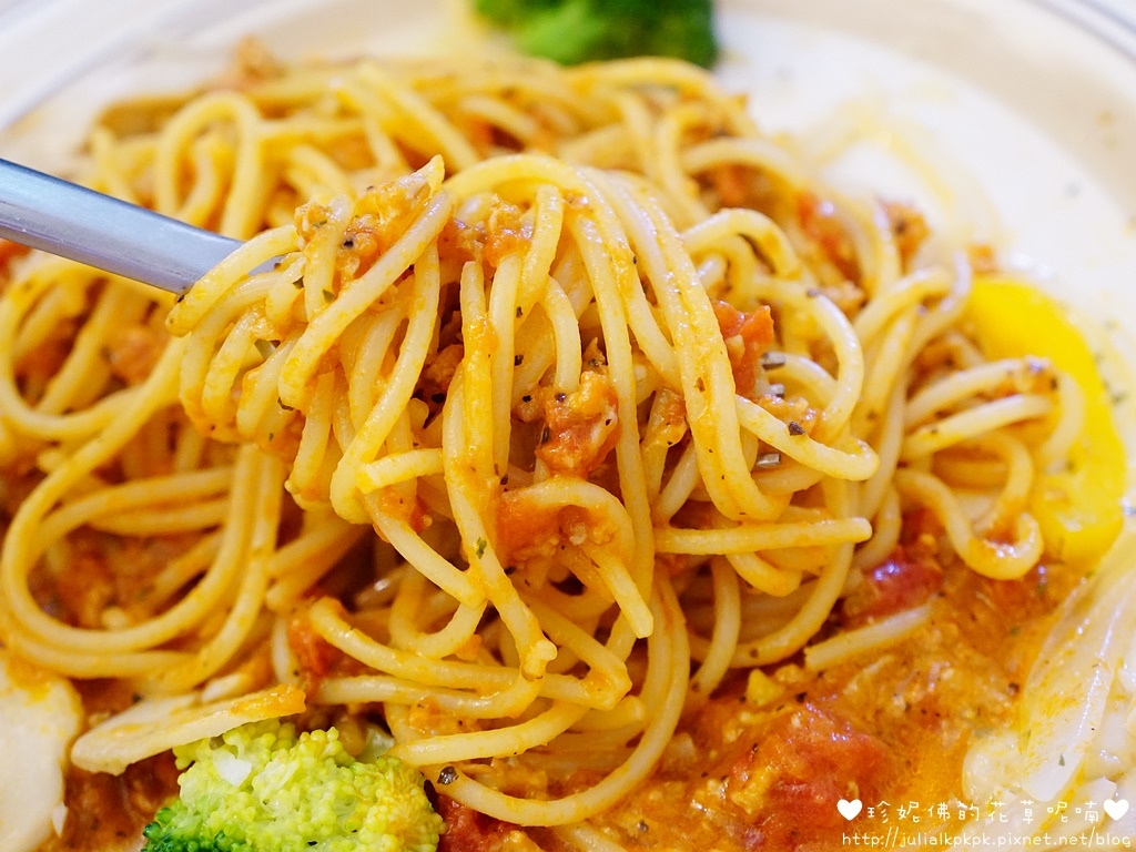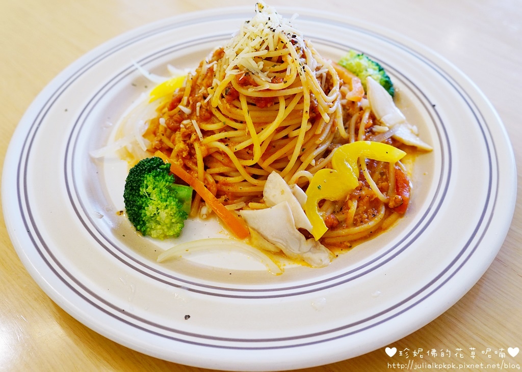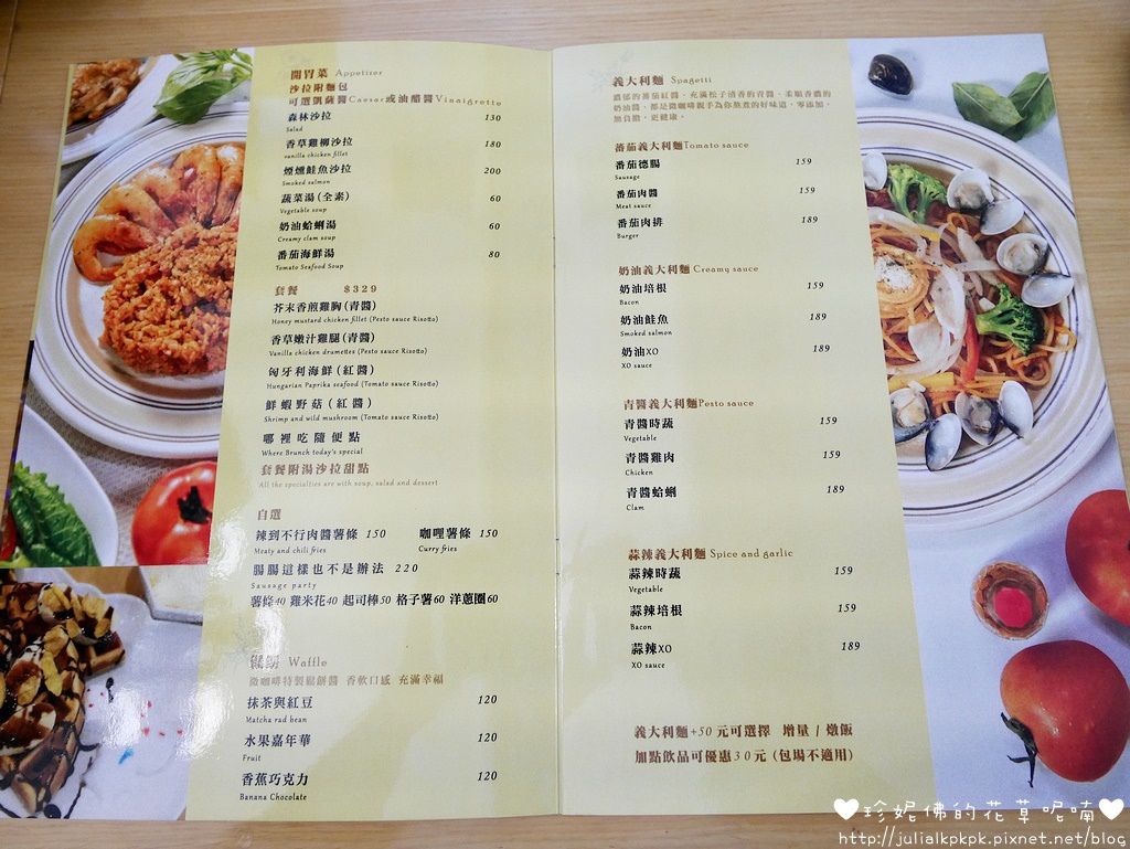 中午點了一份鄉村肉排早午餐、一份番茄肉醬義大利麵及一杯風茹茶,沒有收取服務費喔