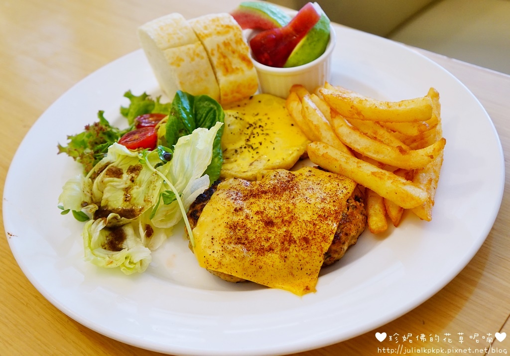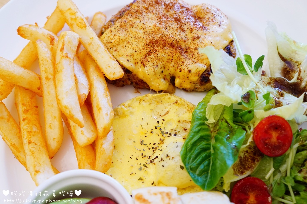 鄉村肉排早午餐,有薯條、起司肉排、生菜、煎蛋、水果及麵包