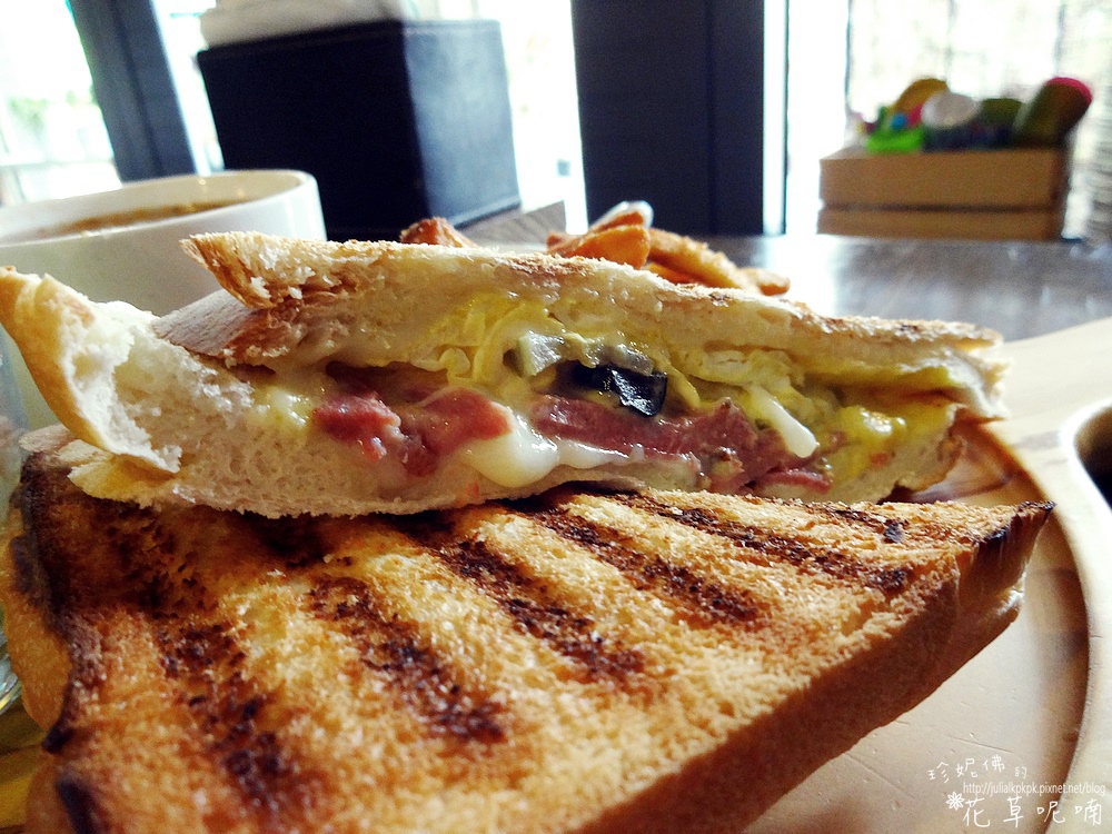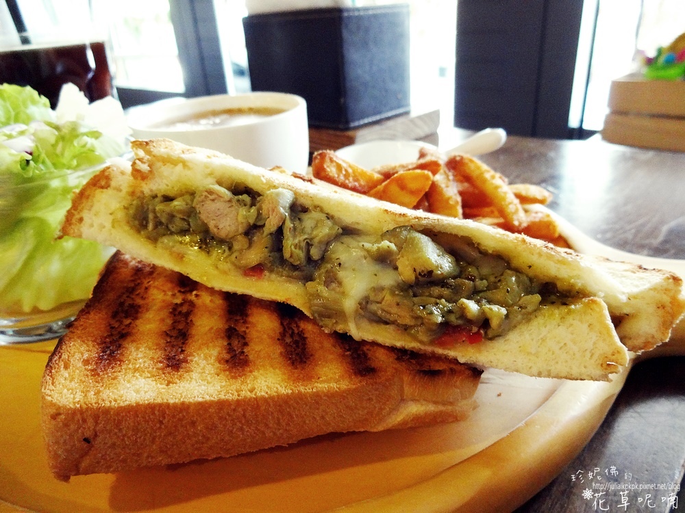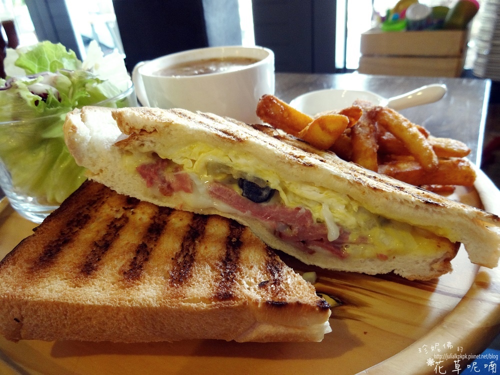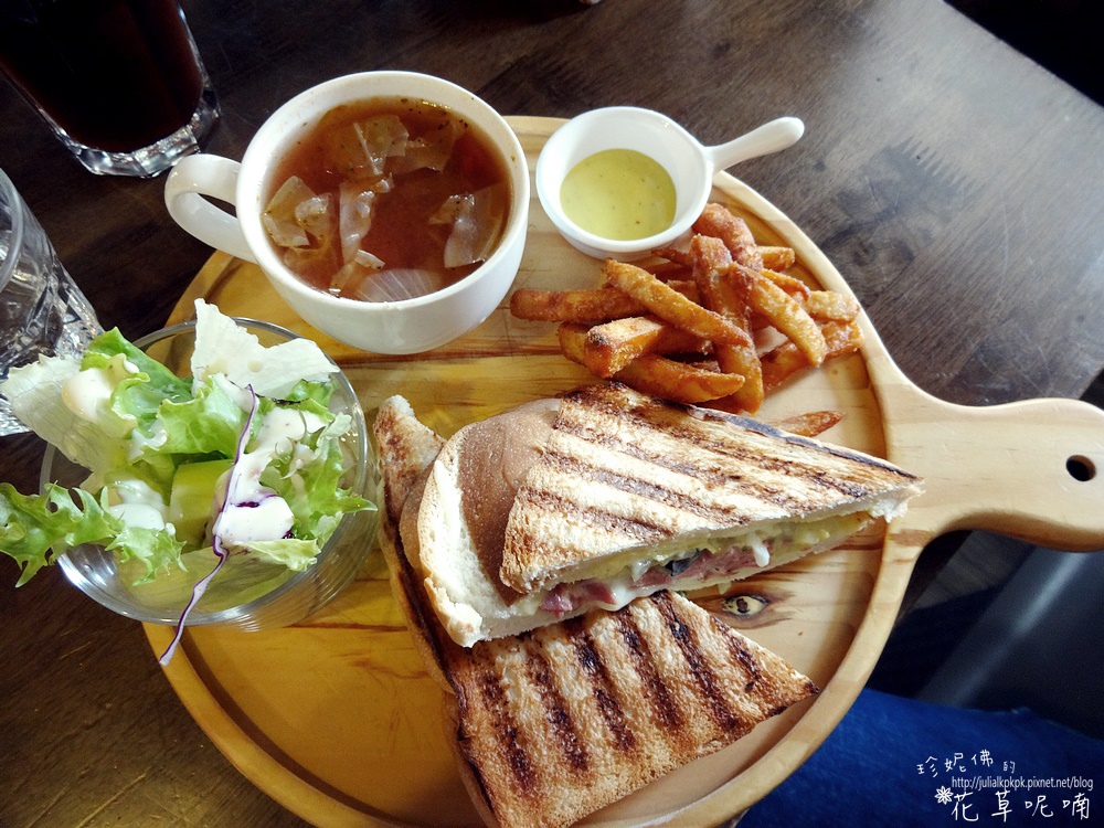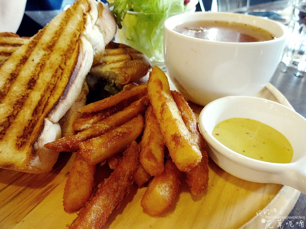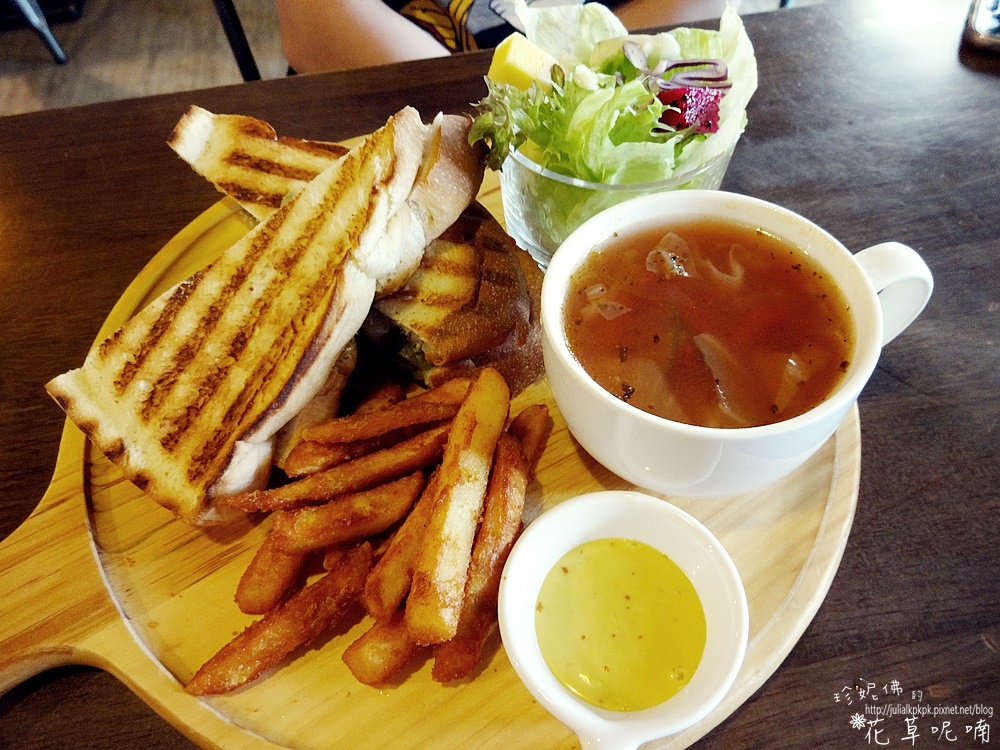 蘿勃香草雞肉帕里尼,有薯條、沙拉及例湯,份量不少,朋友吃的很撐XD