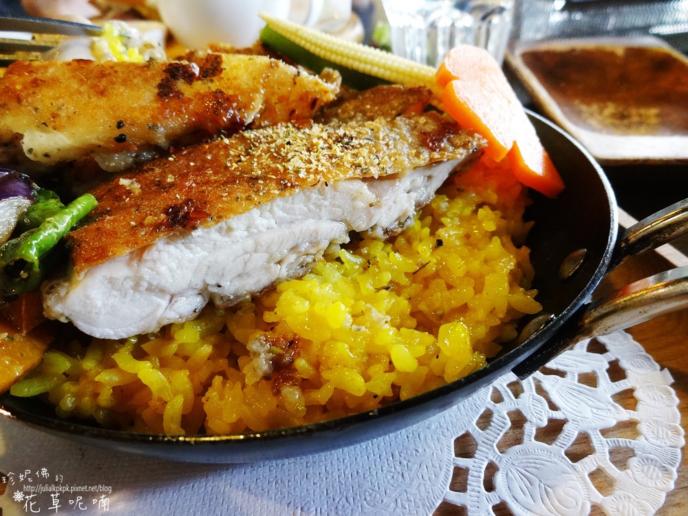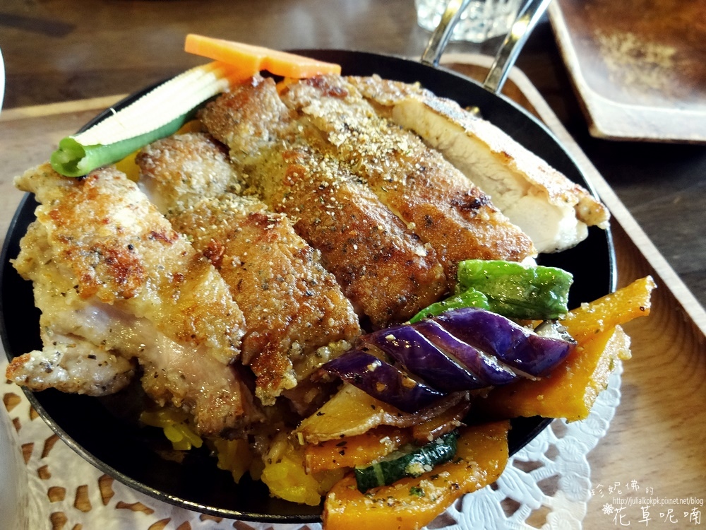 雞腿排外皮烤的很酥且保有肉汁,帶有淡淡的香草味,旁邊搭配的烤地瓜及烤茄子吃起來不膩口,很不錯