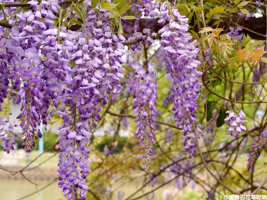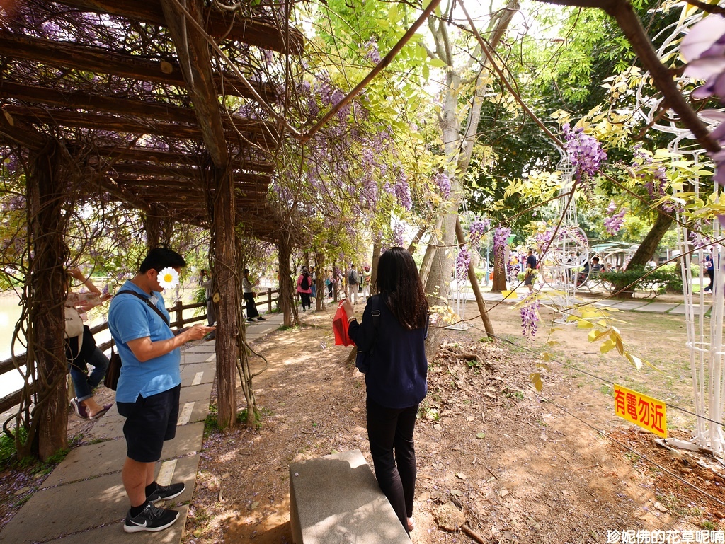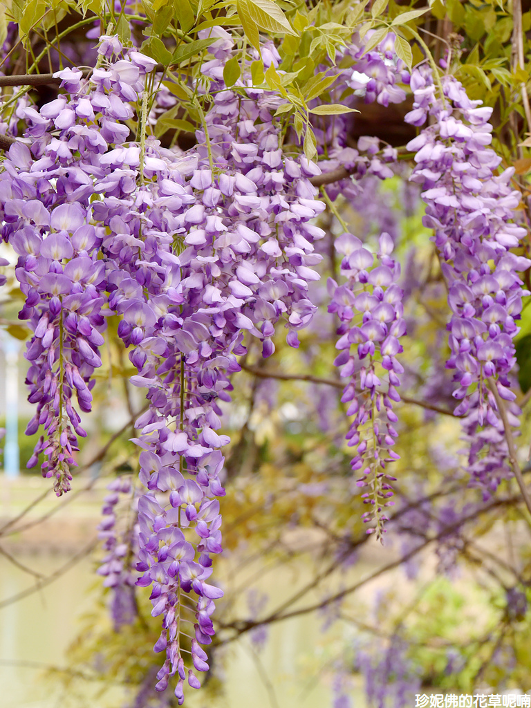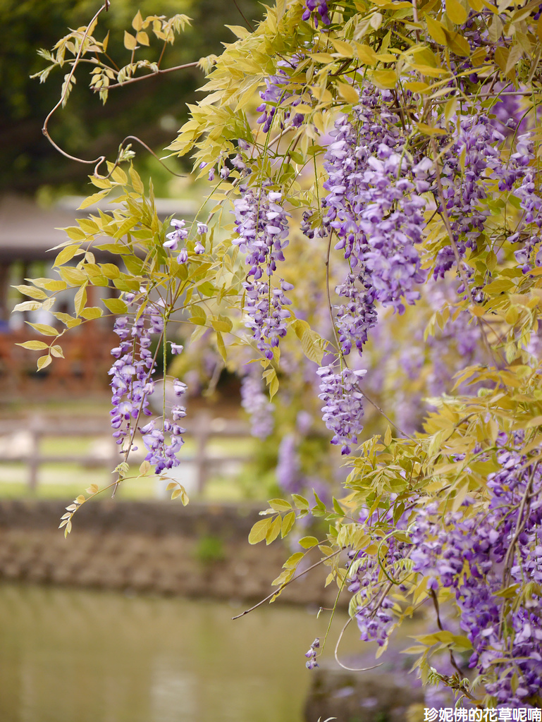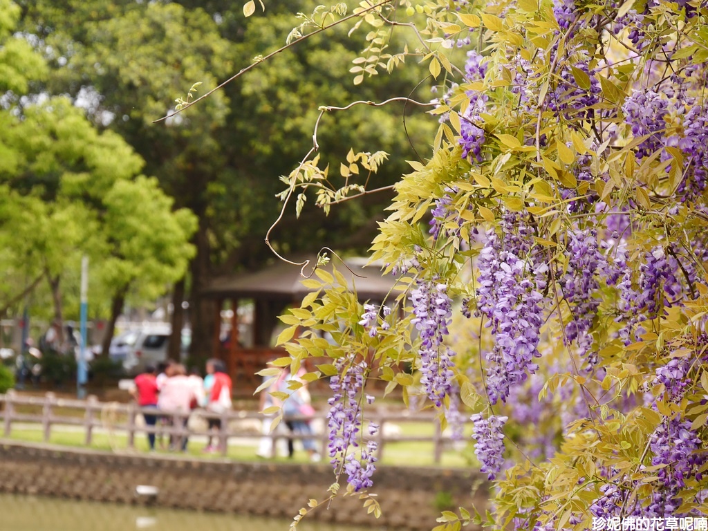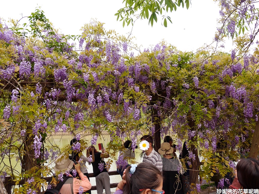 紫藤種在湖畔,真的是遠遠就能看到花架下的人潮