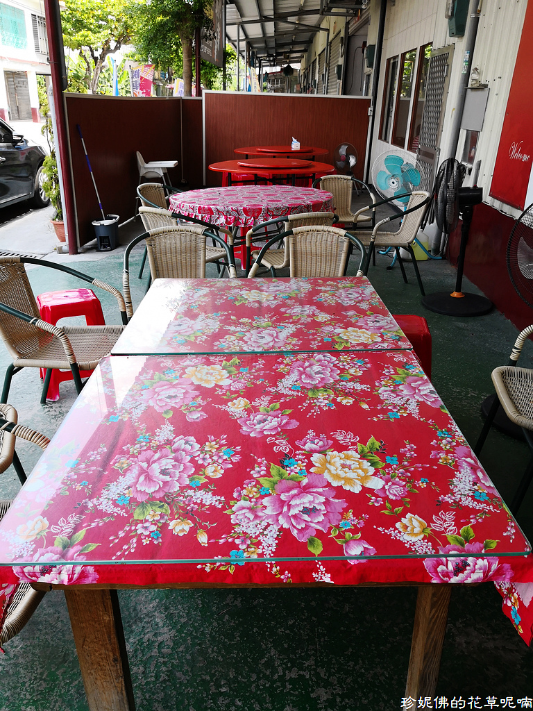 桌布是傳統客家大紅花布,喜氣洋洋的感覺