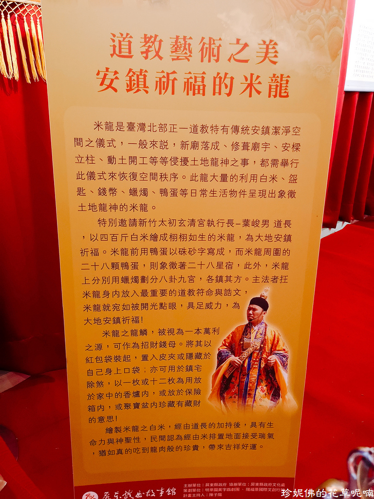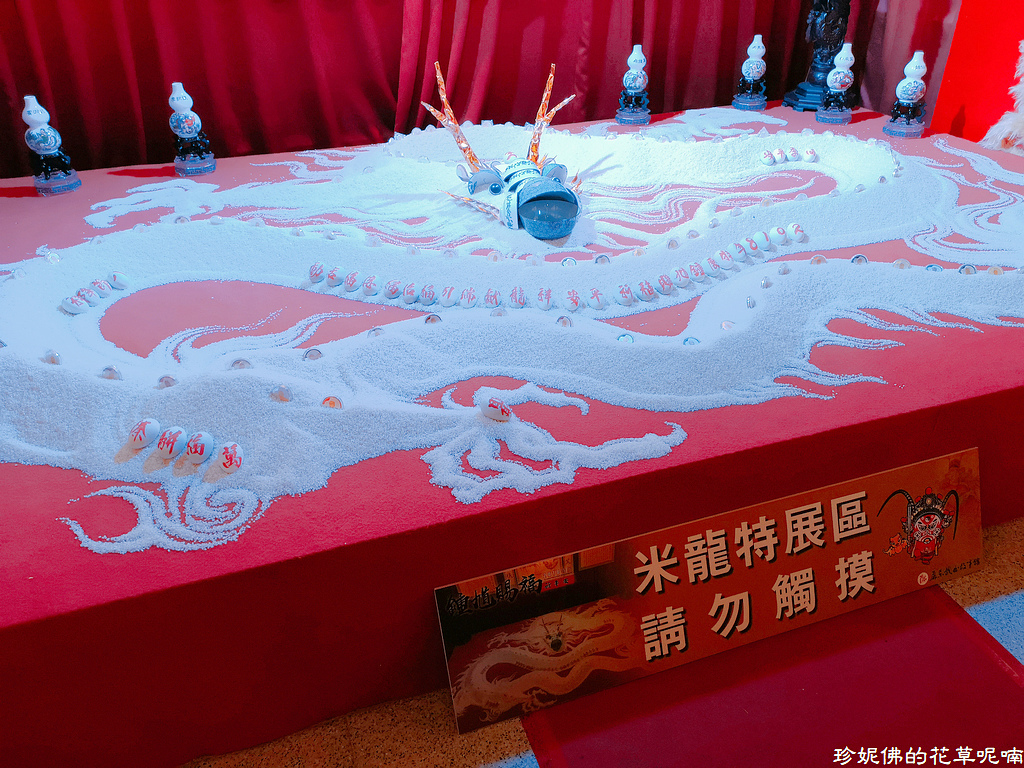 這是運用四百斤白米繪出的米龍,白米因為燈光顏色的不同而呈現出不同顏色,所以看起來並不是這麼白