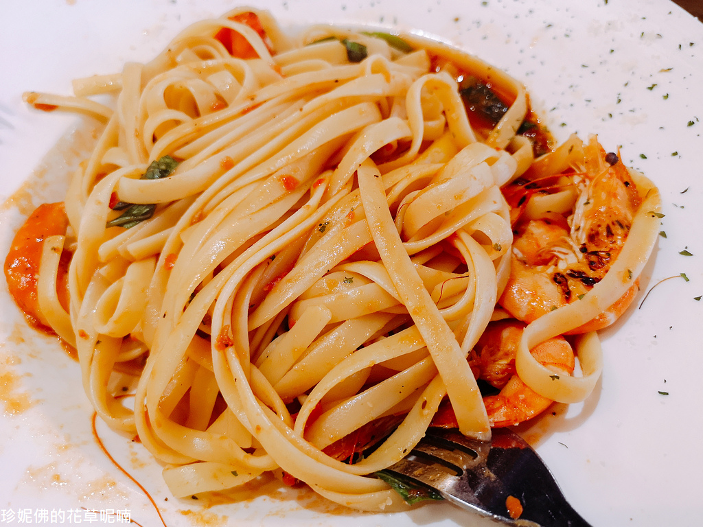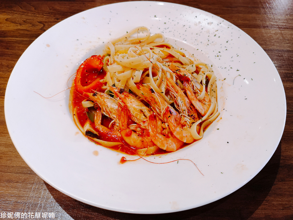 鮮蝦茄汁寬扁麵有花30元加麵,不然應該會不夠吃