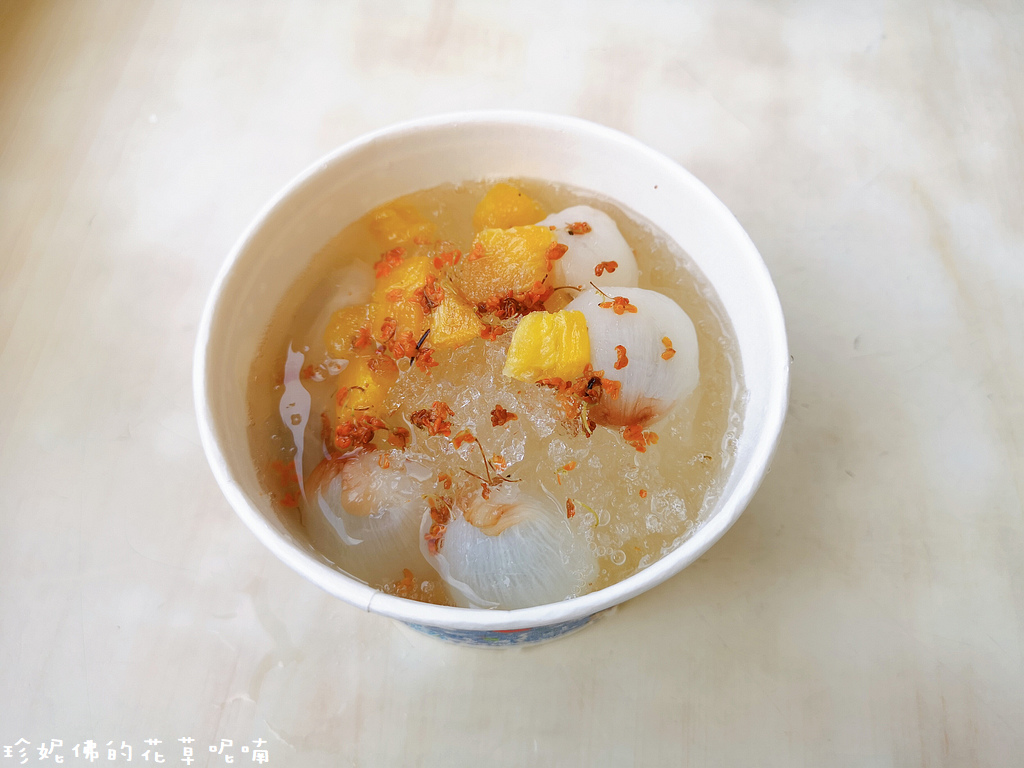 小碎冰搭配鳳梨丁、桂花瓣、還有幾顆香甜荔枝
