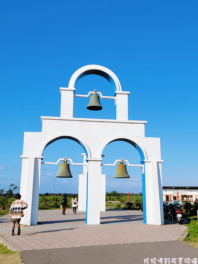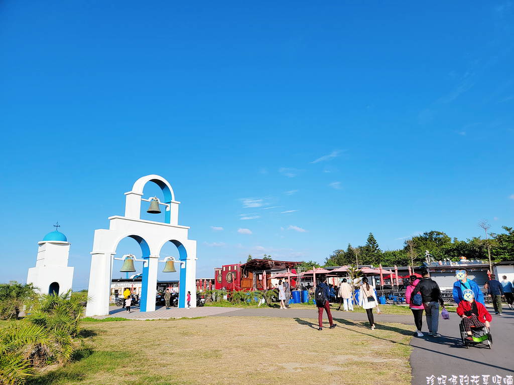 ▲藍白地中海風格造景就在停車場旁邊,路口有紅綠燈