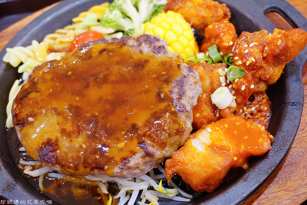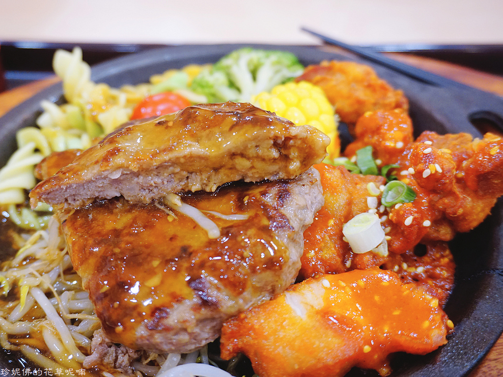 牛肉漢堡排醬汁甜甜的,下方有豆芽菜;辣味雞辣度還好,應該是微辣
