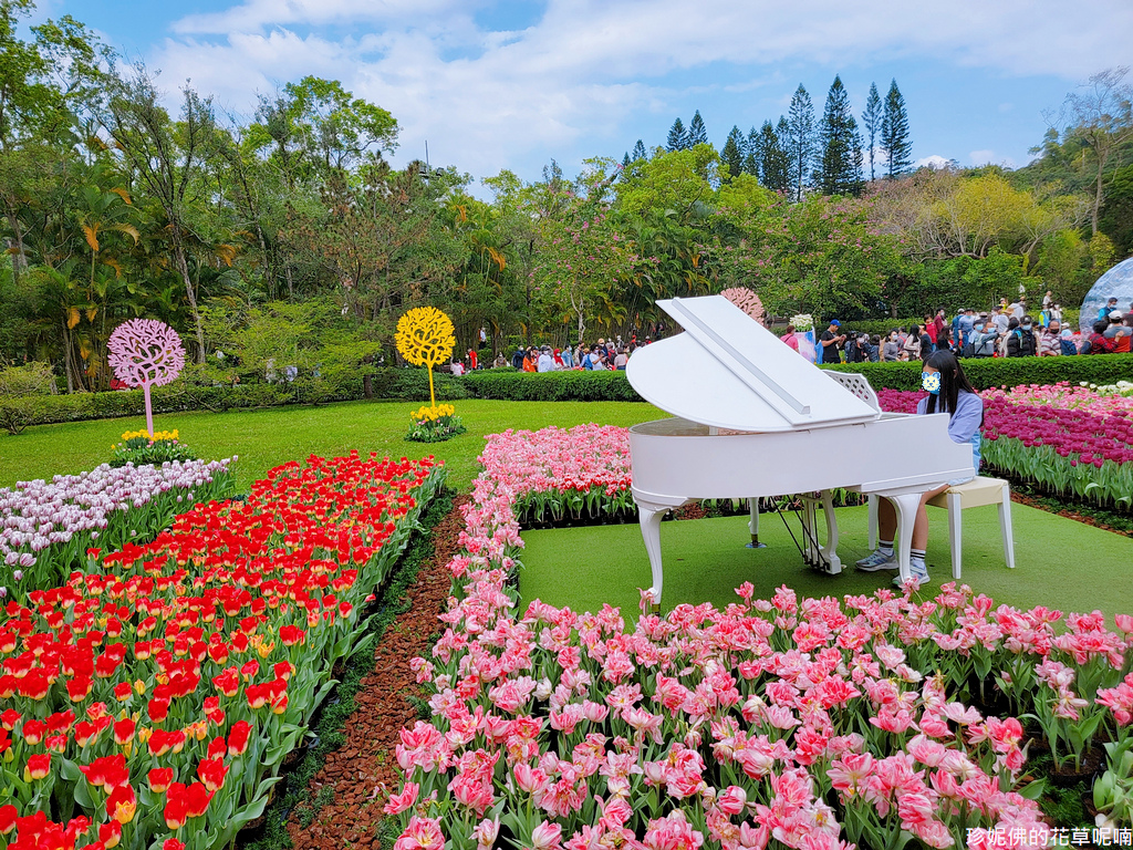 將浪漫的白色鋼琴置於花海中央,彈著鋼琴襯著大片鬱金香
