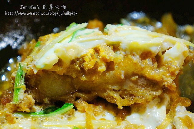這道的作法有點像親子丼,淋上半生不熟的蛋汁,而且豬排就這樣徜徉在高湯中,