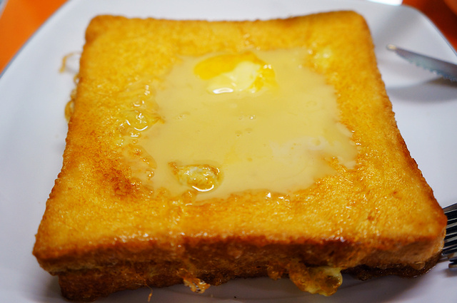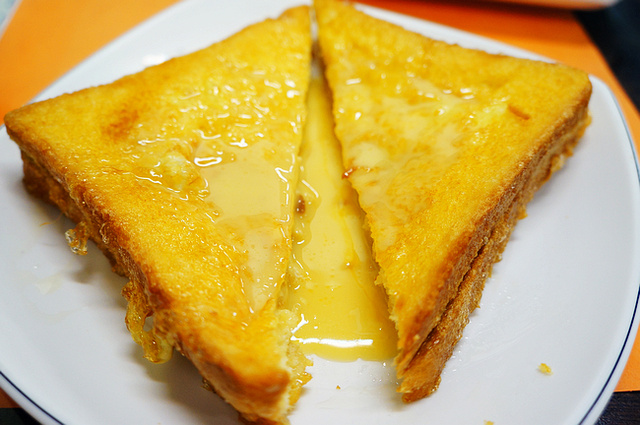 法蘭西多士 ,把吐司沾滿蛋液後油炸,表面很金黃油亮,上面還淋了煉乳,而且吐司裡面