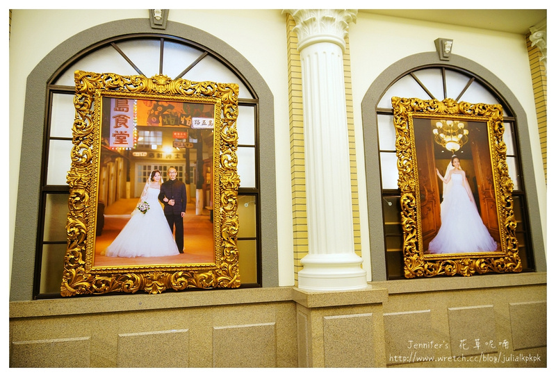 入口大廳處,兩旁牆上高掛著小潘潘與夫婿江欽良的結婚照