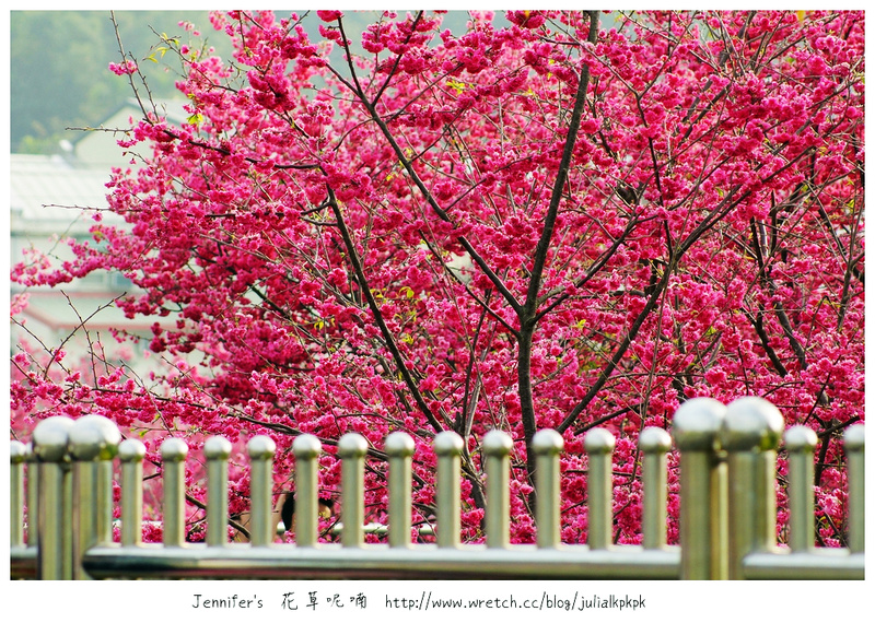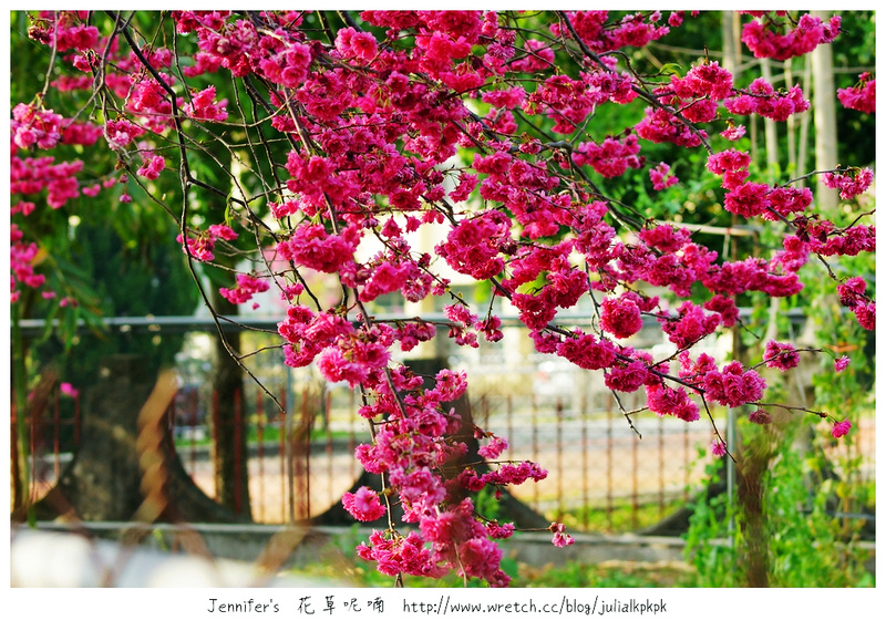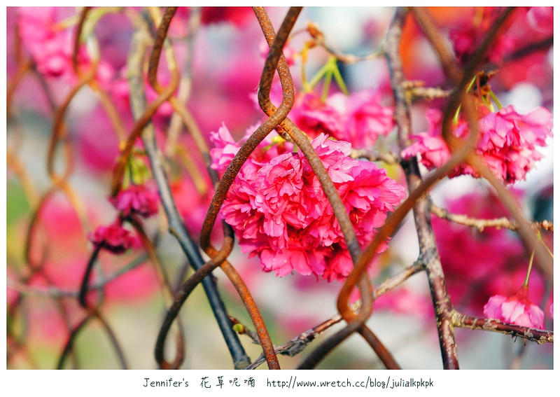 即使是生了鏽的圍籬,依然不減八重櫻的風采