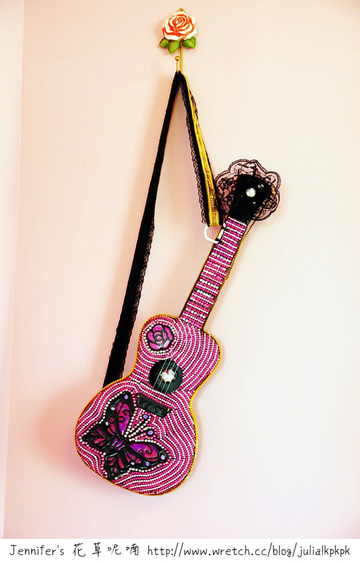 牆上吊著好漂亮的水鑽粉紅吉他,好想揹在身上過過癮吶!